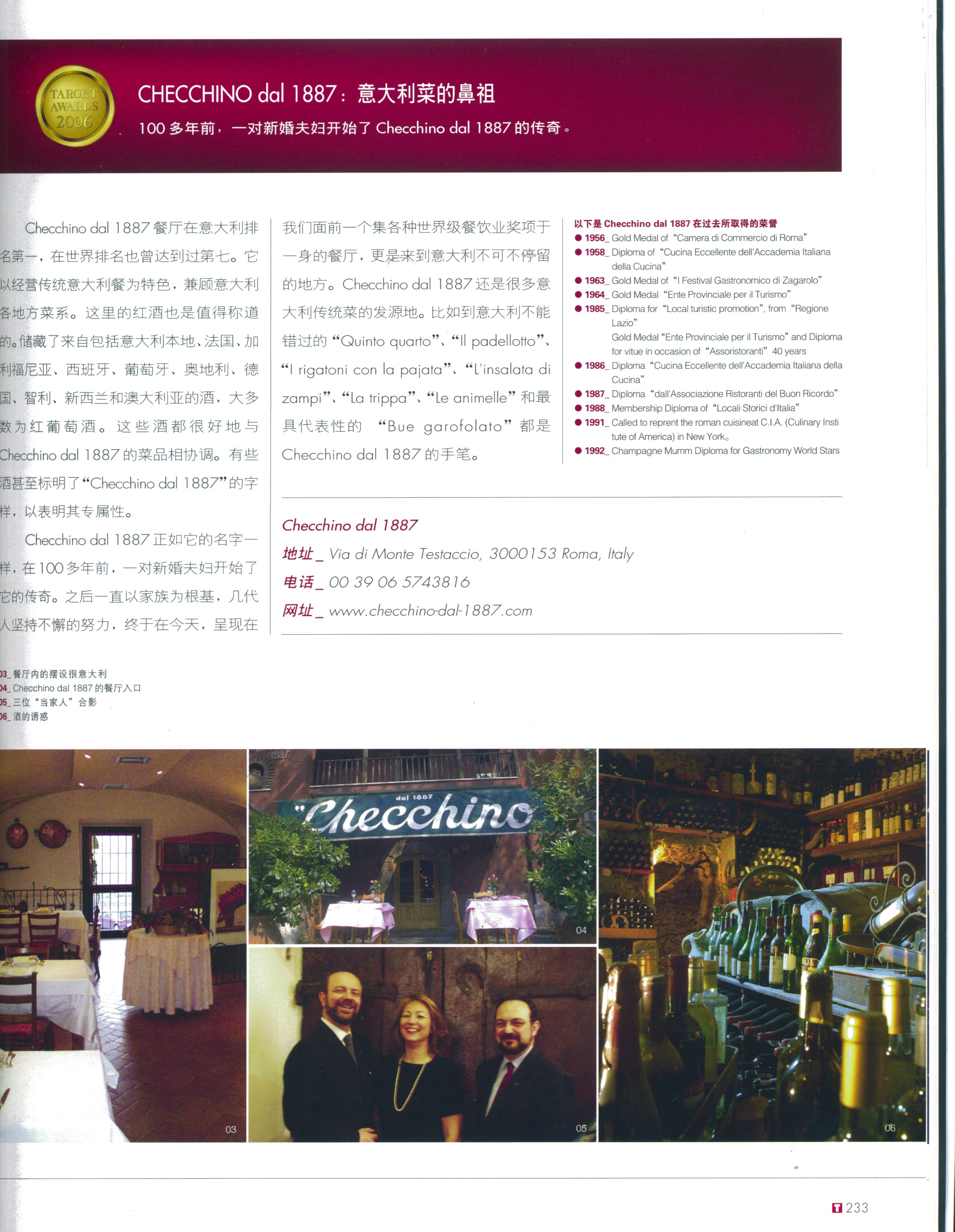 - Gambero Rosso: "Royaume incontesté du "quinto quarto", pierre angulaire de la cuisine romaine, le checchino est une institution depuis plus de 150 ans