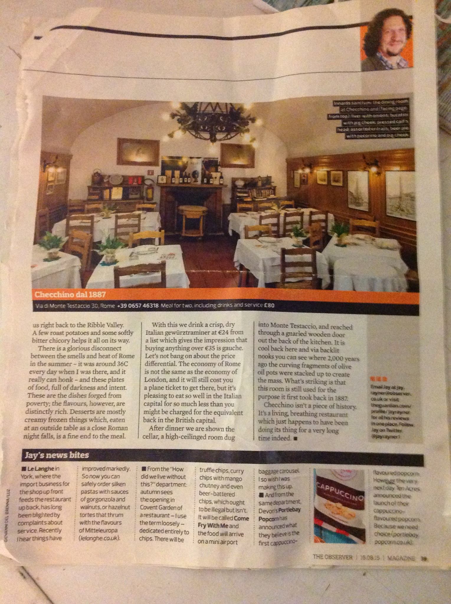 - Gambero Rosso: "Royaume incontesté du "quinto quarto", pierre angulaire de la cuisine romaine, le checchino est une institution depuis plus de 150 ans